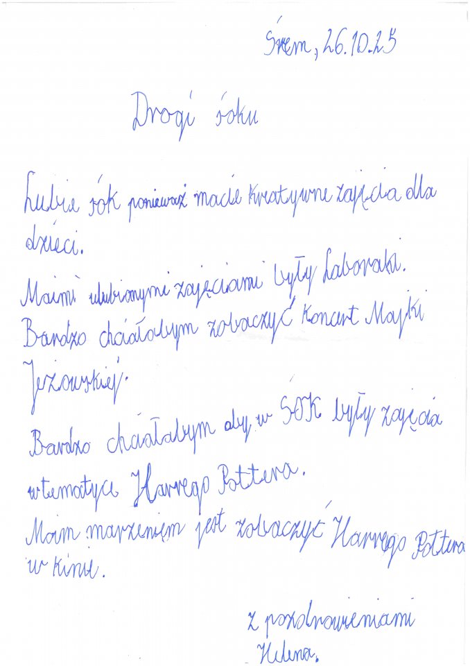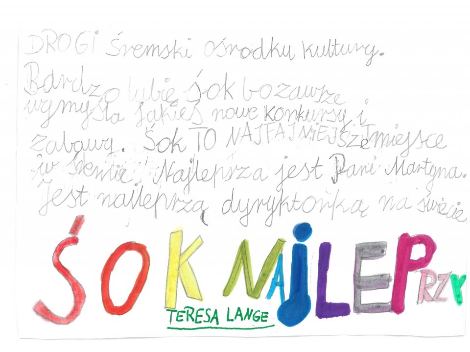 Wasze listy były pełne ciepłych słów, pomysłów i inspiracji. Z radością czytaliśmy, za co lubicie Śremski Ośrodek Kultury, jakie zajęcia sprawiają Wam największą frajdę oraz jakie wydarzenia chcielibyście zobaczyć w przyszłości.